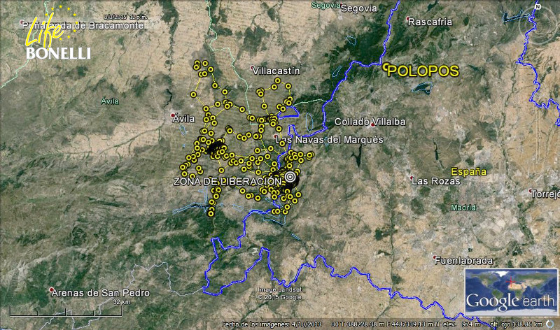 As the development of the Life Bonelli Project, during 2015 we have released twelve specimen of Bonelli’s Eagles in the Sierra Oeste (Eastern mountains) of the Community of Madrid. Eleven of them are still living free, but one had to be captured due to a malformation of a wing. Well, after several months in the liberation zone, some of them have decided to emigrate.
